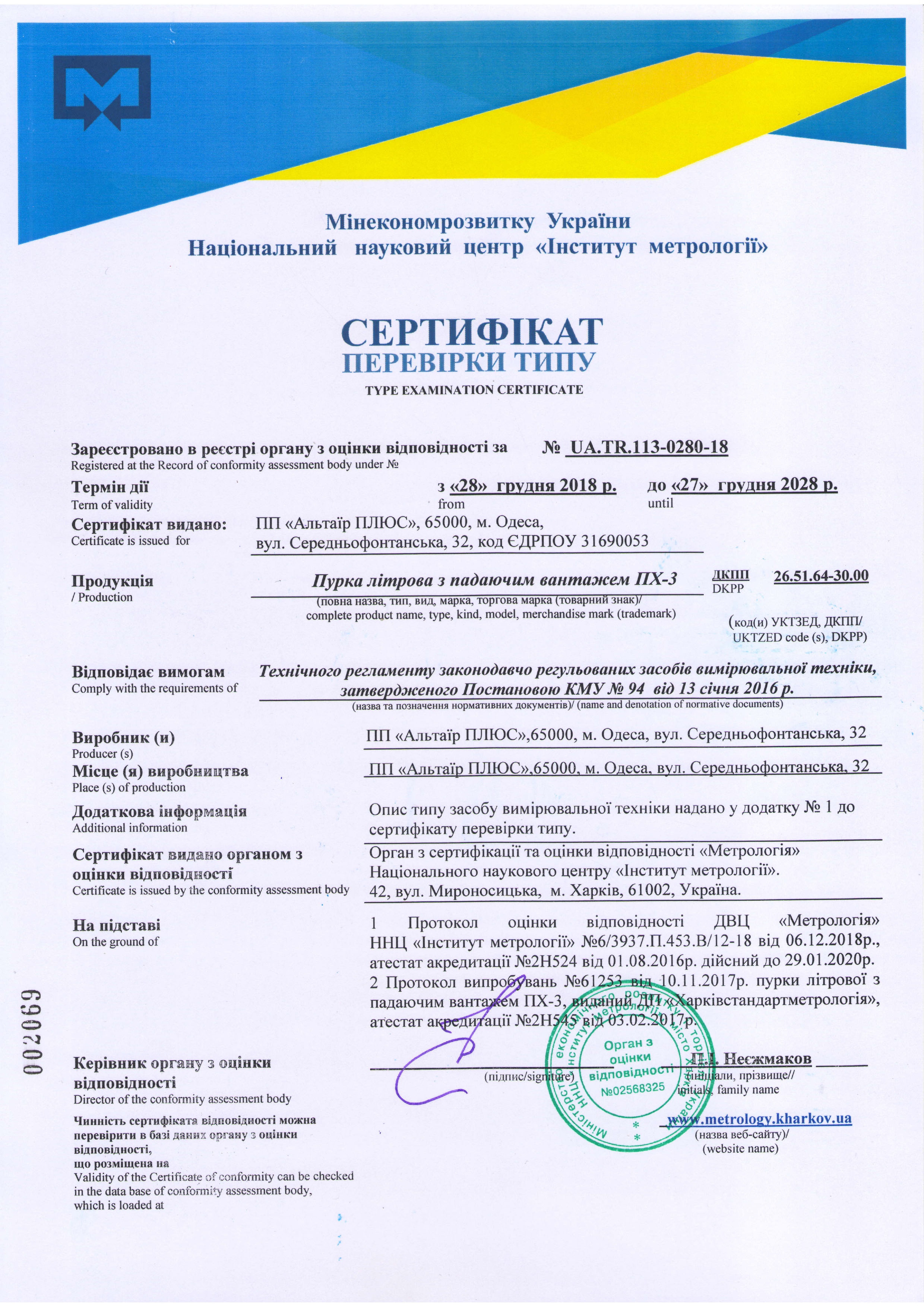 У 2018 році компанія "Альтаїр Плюс" отримала сертифікат відповідності на пурку літрову робочу з падаючим вантажем моделі ПХ-3 власного віробництва. Національним науковим центром "Інститут метрології" був виданий відповідний "Сертифікат Перевірки Типу". Що в свою чергу говорить про те, що продукція, що випускається пурка відповідає вимогам технічного регламенту законодавчо регульованих засобів вимірювальної техніки.